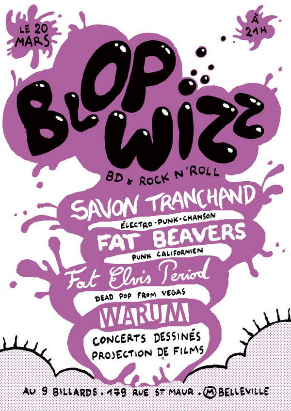 Les mardis du 9Billards c'est du Rock n'Roll avec des morceaux de bande dessinée. On verra cette fois-là SAVON TRANCHAND (avec le dessinateur Benoît Preteseille dedans), les FAT ELVIS PERIOD (avec le dessinateur Prosperi Buri et Julien du Comptoir des Indépendants dedans) et les FAT BEAVERS (avec Eric de l'Association et Julie de Cornelius dedans). Ces concerts seront accompagnés de dessin en live et on verra une projection d'un film d'animation magnifique de Mélanie Berger.20 mars 2007, 21:00