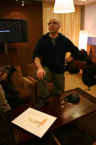 C'est désormais la coutume : cette distinction est matérialisée par un dessin original réalisé spécialement par le lauréat précédent. Etienne Davodeau, qui était récompensé un an plus tôt pour Les mauvaises gens (éditions Delcourt), assistait à l'événement.