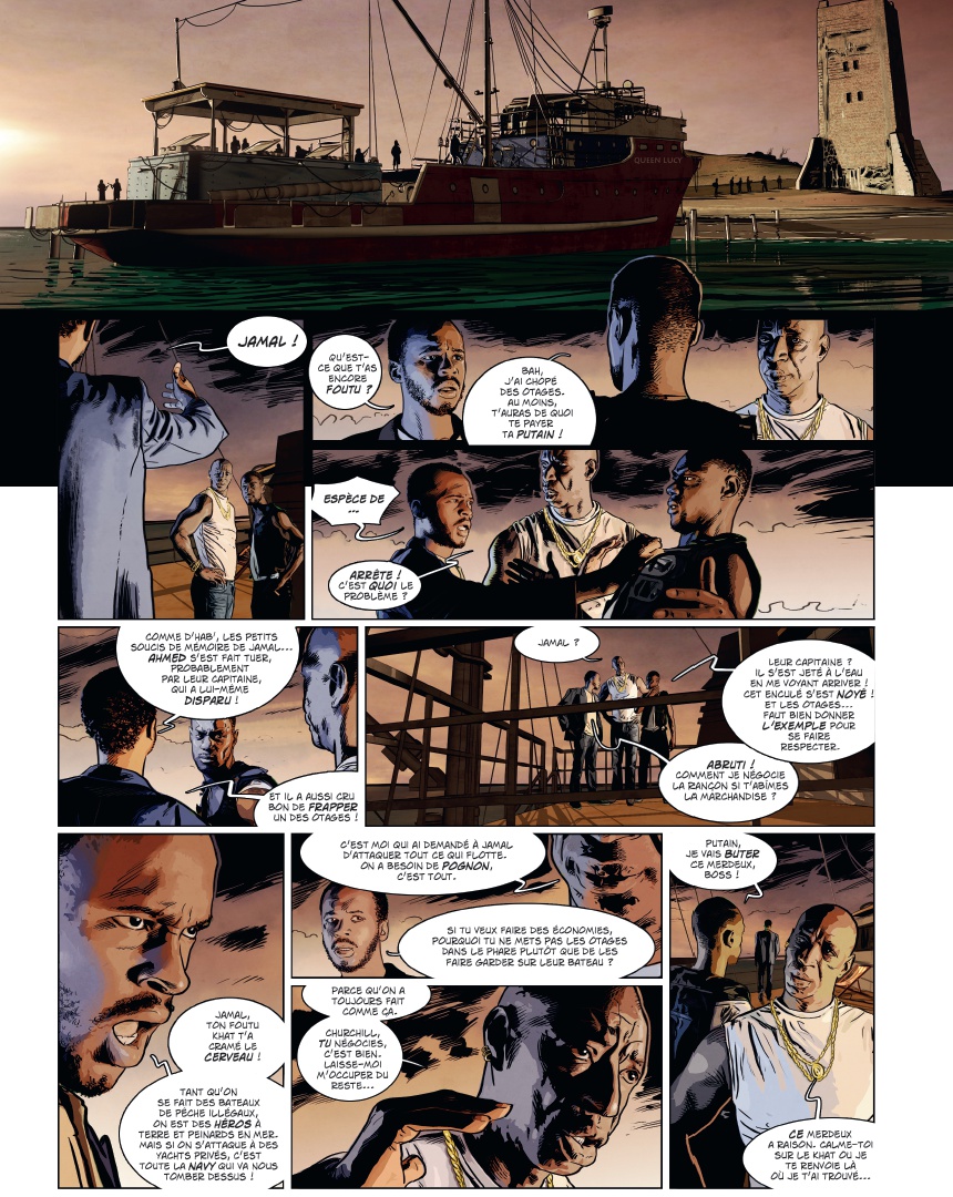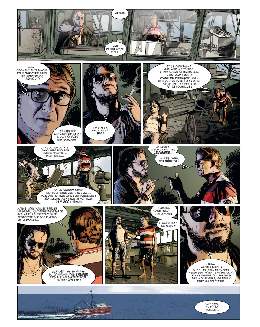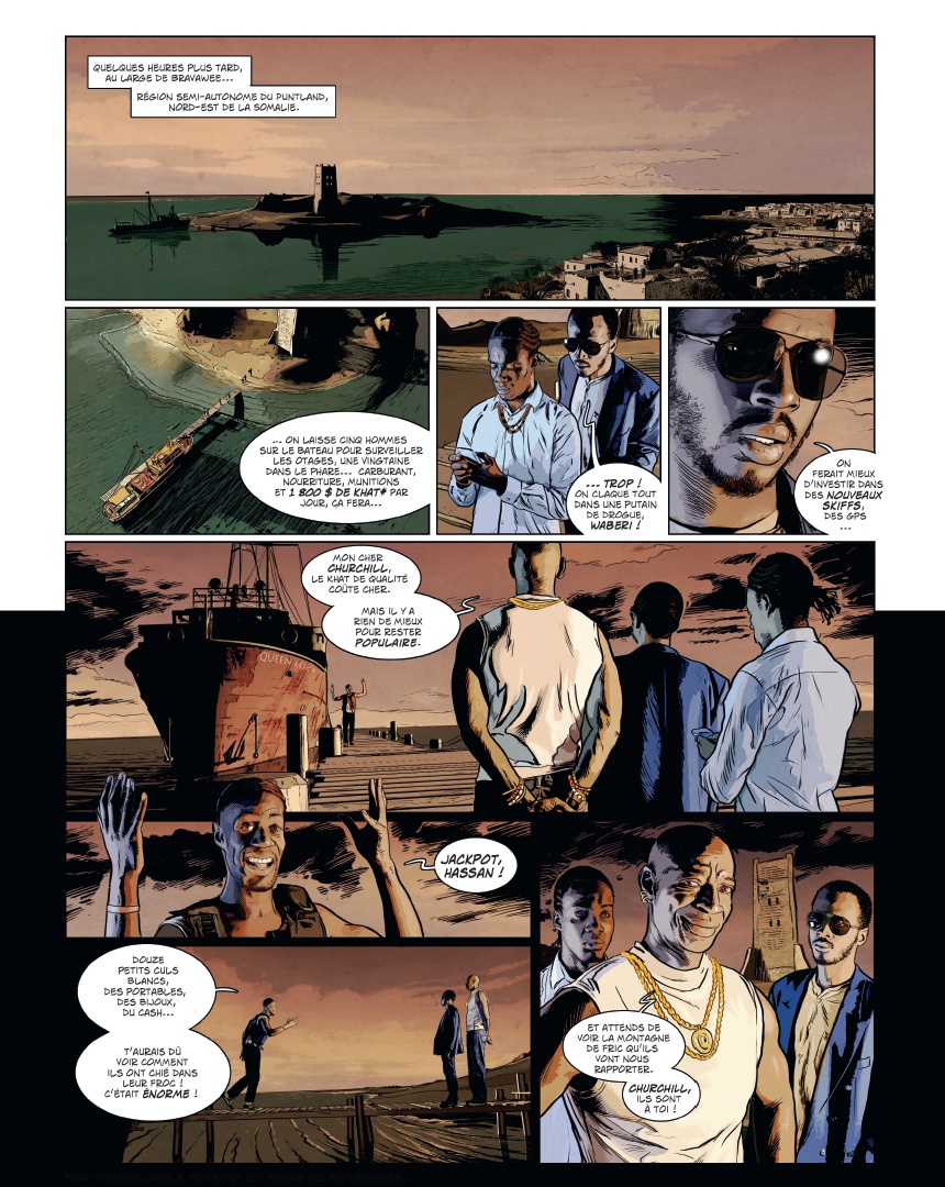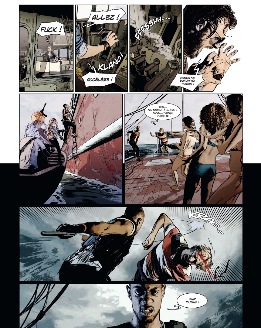 U ne plongée vertigineuse dans le monde de la piraterie moderne Maxime Stern, la quarantaine, buriné, est skipper à bord du yacht de luxe Trinity, sous le soleil du golfe de lAden au large de la Somalie. Alors que son embarcation est victime dun assaut de pirates, Maxime, blessé, finit jeté à la mer. Recueilli par une famille de pêcheurs somaliens, il a une dette envers eux. Pour sen acquitter, il décide de sassocier au chef pirate de la région. Pris dans lengrenage, il va petit à petit découvrir les véritables enjeux de la piraterie moderne : un « mal nécessaire », et peut-être le seul moyen de défense dune population démunie face à limpérialisme occidental Dans un pays en guerre depuis deux décennies, où le moindre civil occidental vaut 1 million de dollars et où les pirates sont des héros du peuple, découvrez lenvers du décor du phénomène à travers les yeux dun ancien militaire français, destiné à devenir le premier seigneur blanc des pirates ! Les frères Dorison cosignent une fiction âpre et violente que le trait ultra réaliste de Jean-Michel Ponzio finit dancrer dans la réalité sordide à laquelle elle fait référence.