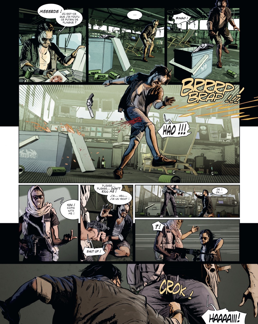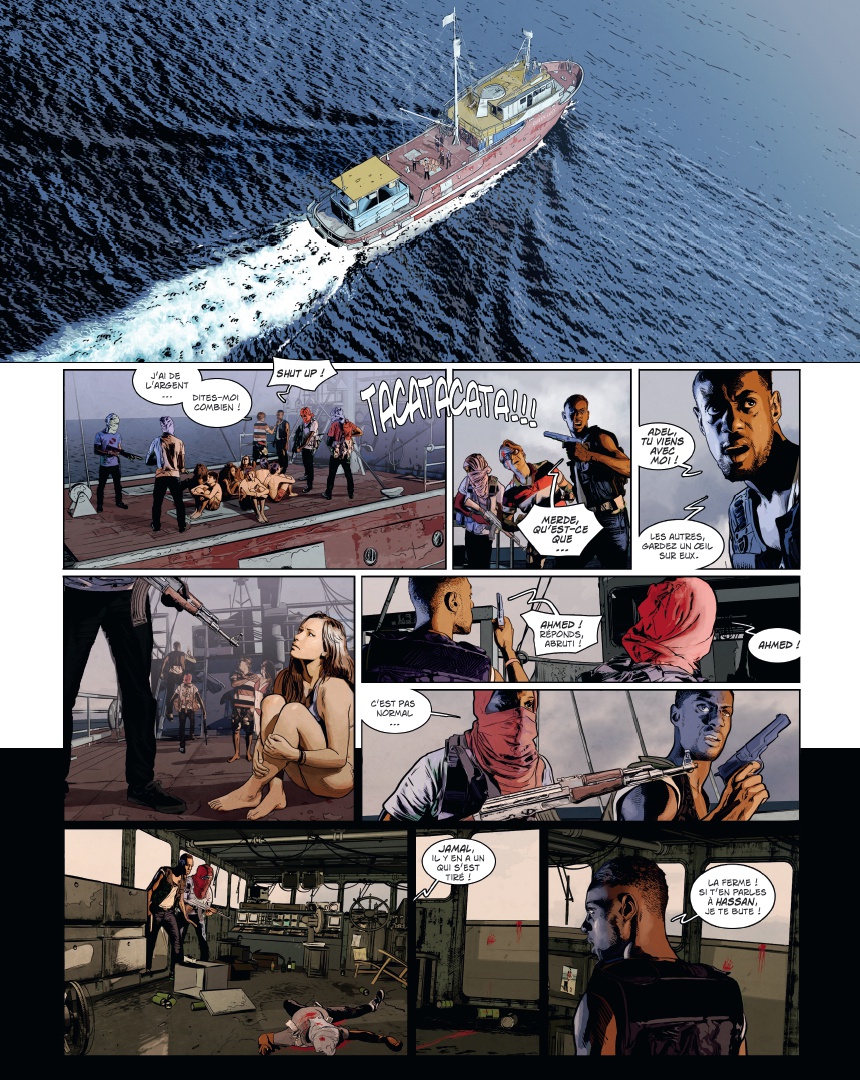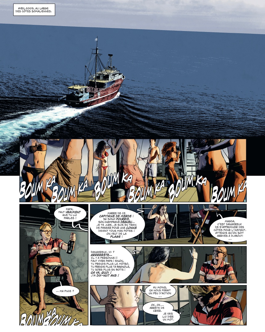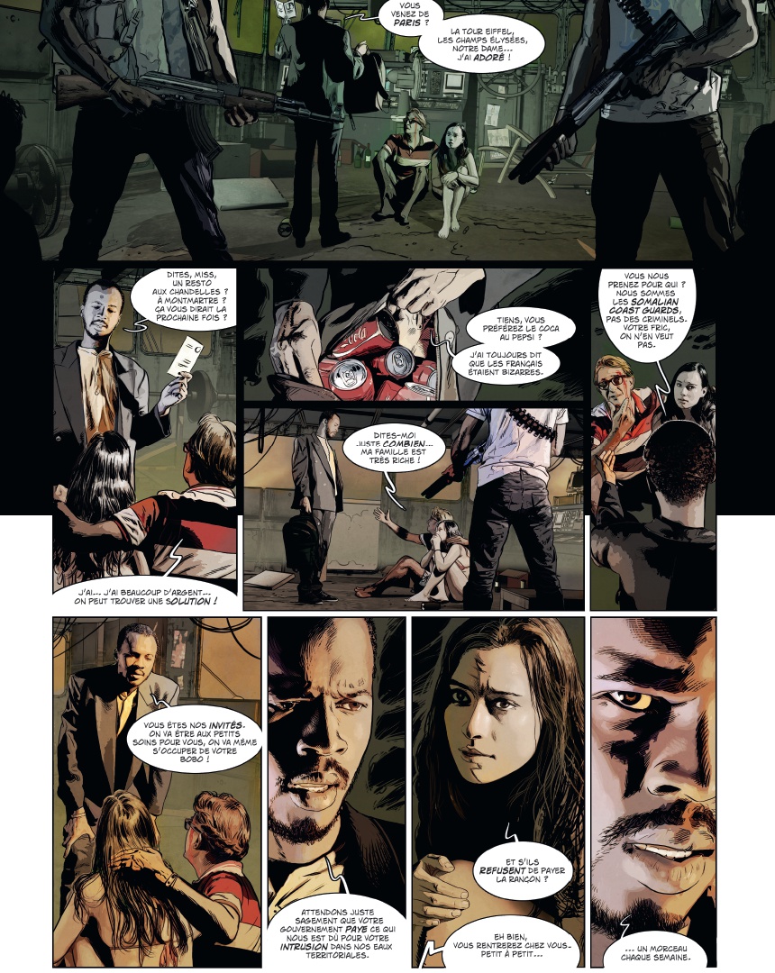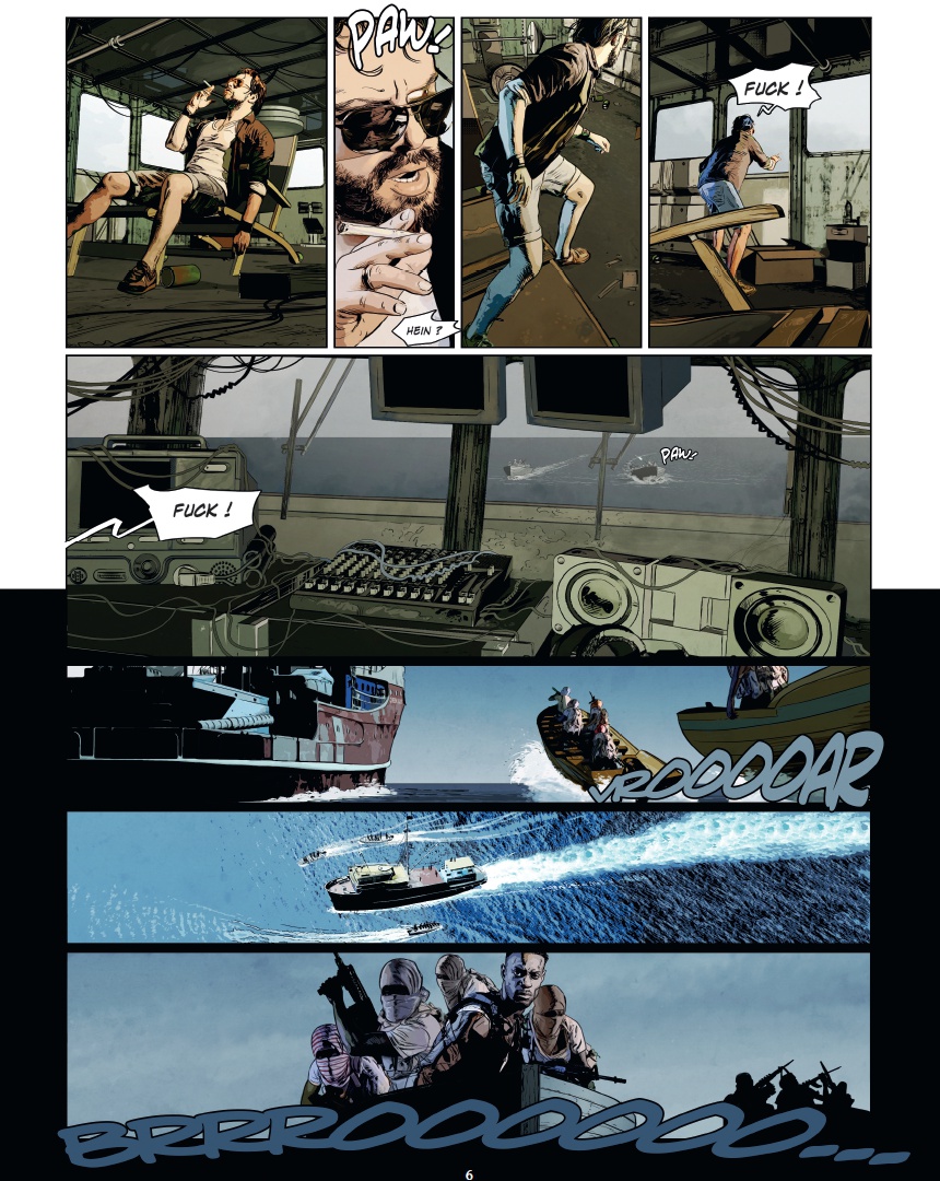 U ne plongée vertigineuse dans le monde de la piraterie moderne Maxime Stern, la quarantaine, buriné, est skipper à bord du yacht de luxe Trinity, sous le soleil du golfe de lAden au large de la Somalie. Alors que son embarcation est victime dun assaut de pirates, Maxime, blessé, finit jeté à la mer. Recueilli par une famille de pêcheurs somaliens, il a une dette envers eux. Pour sen acquitter, il décide de sassocier au chef pirate de la région. Pris dans lengrenage, il va petit à petit découvrir les véritables enjeux de la piraterie moderne : un « mal nécessaire », et peut-être le seul moyen de défense dune population démunie face à limpérialisme occidental Dans un pays en guerre depuis deux décennies, où le moindre civil occidental vaut 1 million de dollars et où les pirates sont des héros du peuple, découvrez lenvers du décor du phénomène à travers les yeux dun ancien militaire français, destiné à devenir le premier seigneur blanc des pirates ! Les frères Dorison cosignent une fiction âpre et violente que le trait ultra réaliste de Jean-Michel Ponzio finit dancrer dans la réalité sordide à laquelle elle fait référence.