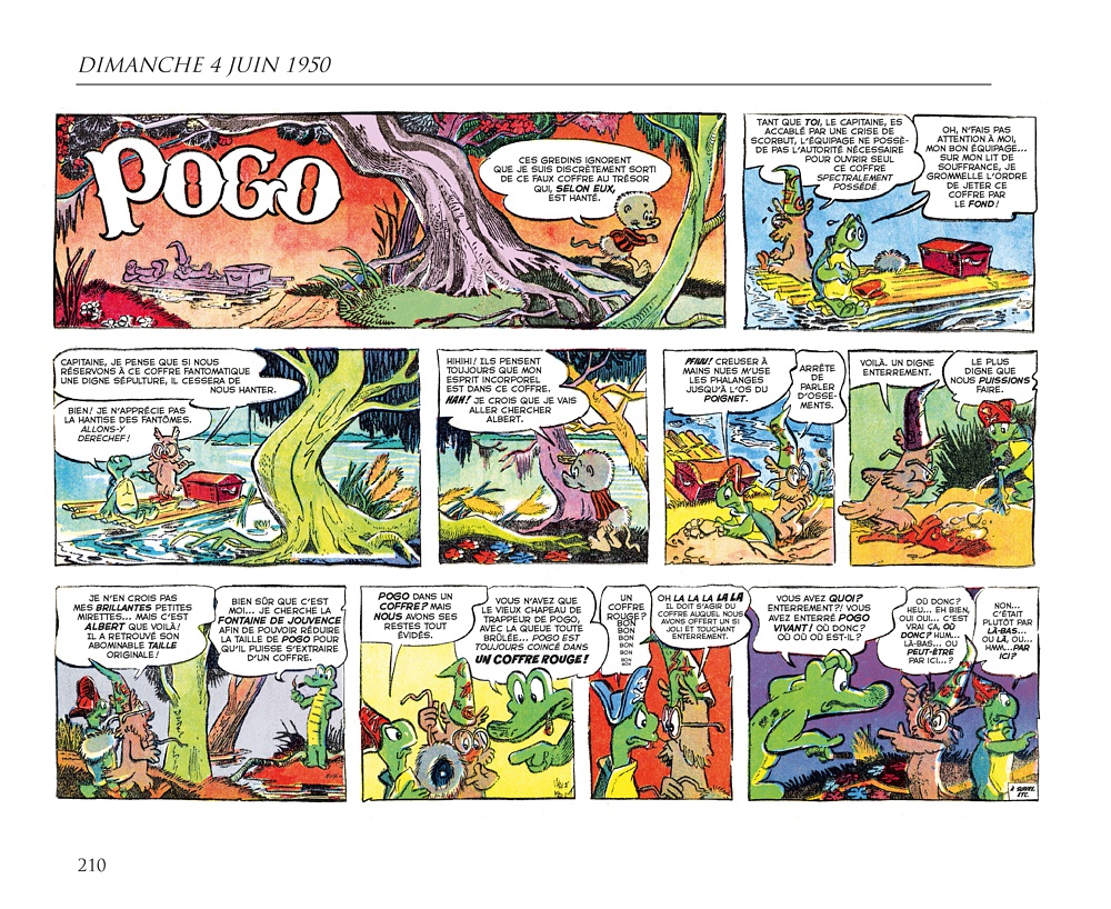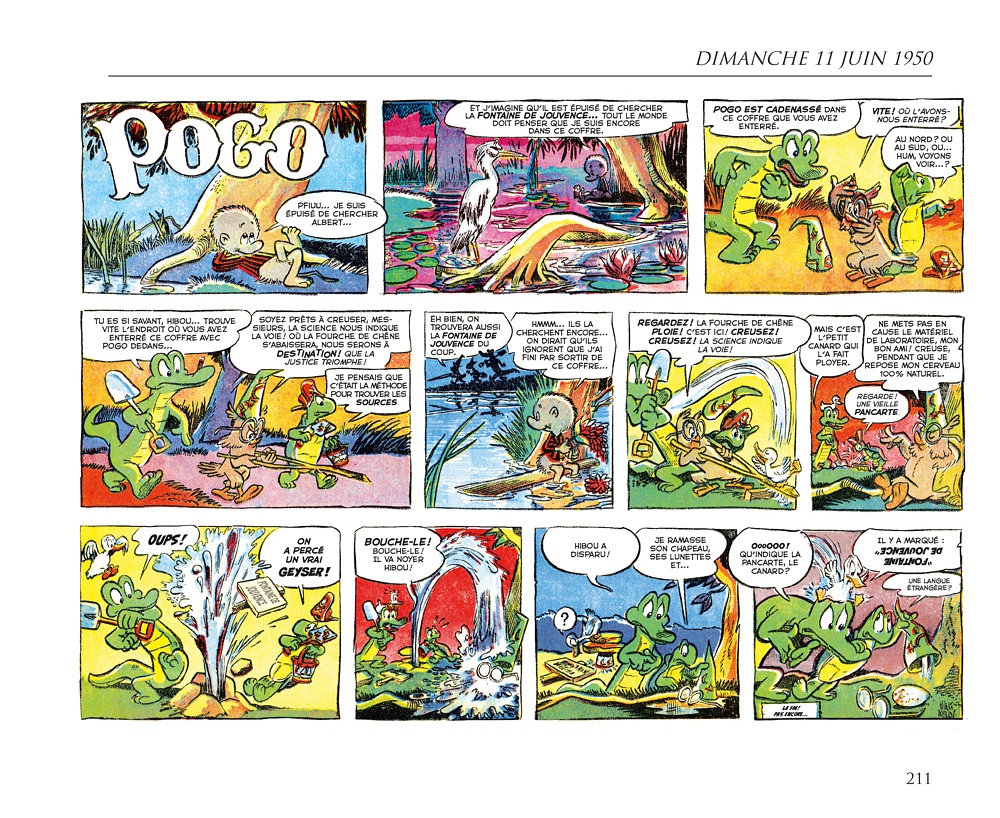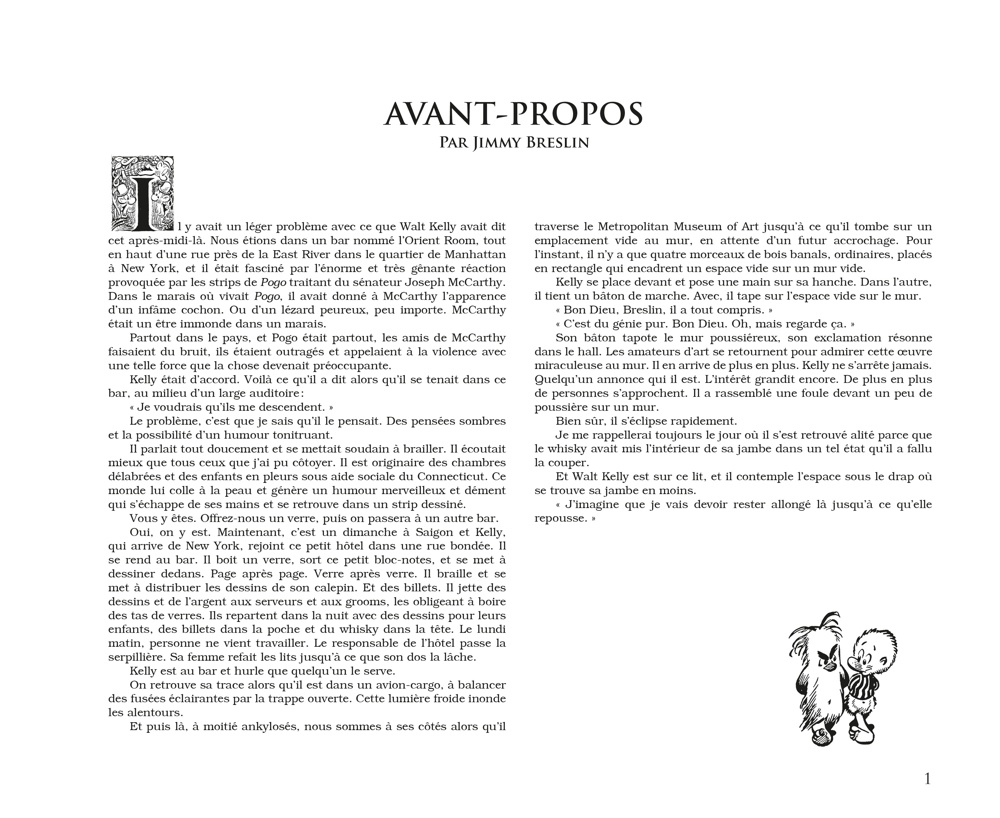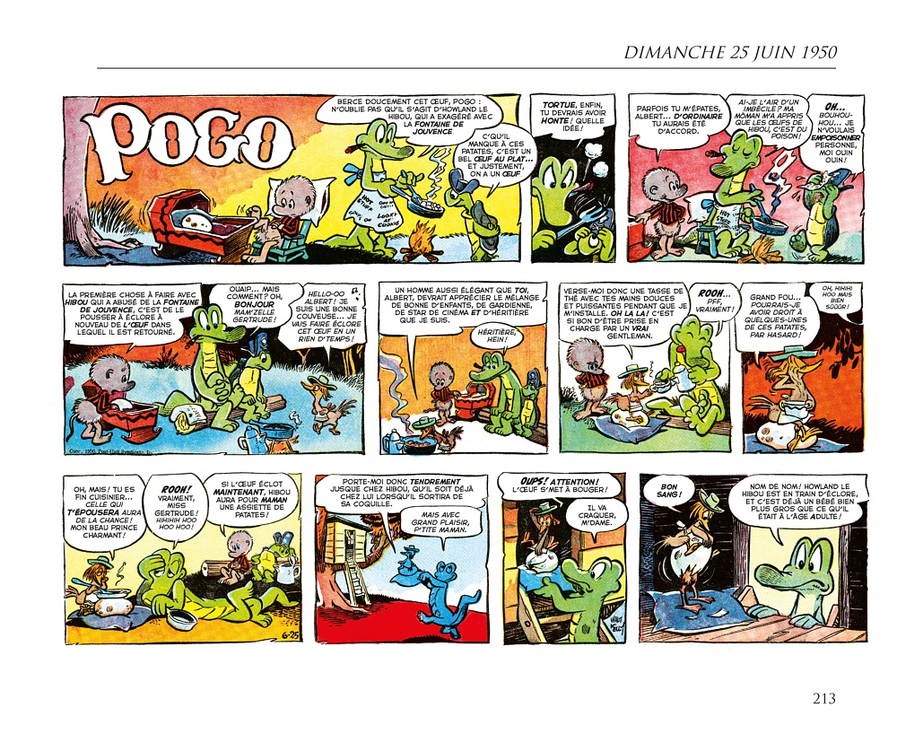 D e 1948 jusqu’à la mi-1973, le Pogo de Walt Kelly était l’un des strips les plus brillants des pages BD des journaux américains avec des personnages haut en couleur (même pour une série en noir et blanc), plein d’humour et d’intelligence. Il s’agissait d’une bande dessinée qui présupposait que ses lecteurs étaient eux aussi drôles et intelligents… Sinon, on pouvait toujours admirer les jolis dessins. Le style fertile et vivant de Kelly vous attirait dans son marais, et sa délirante galerie de personnages vous poussait à y revenir suivre les aventures de Pogo Possum, mais aussi d’Albert Alligator, Churchy LaFemme, de la charmante Mam’zelle Hepzibah, de Porky Pine et des centaines d’autres habitants mémorables des marais qui ont jailli de l’esprit et du pinceau de Kelly. L’un des sommets de l’histoire de la bande dessinée.