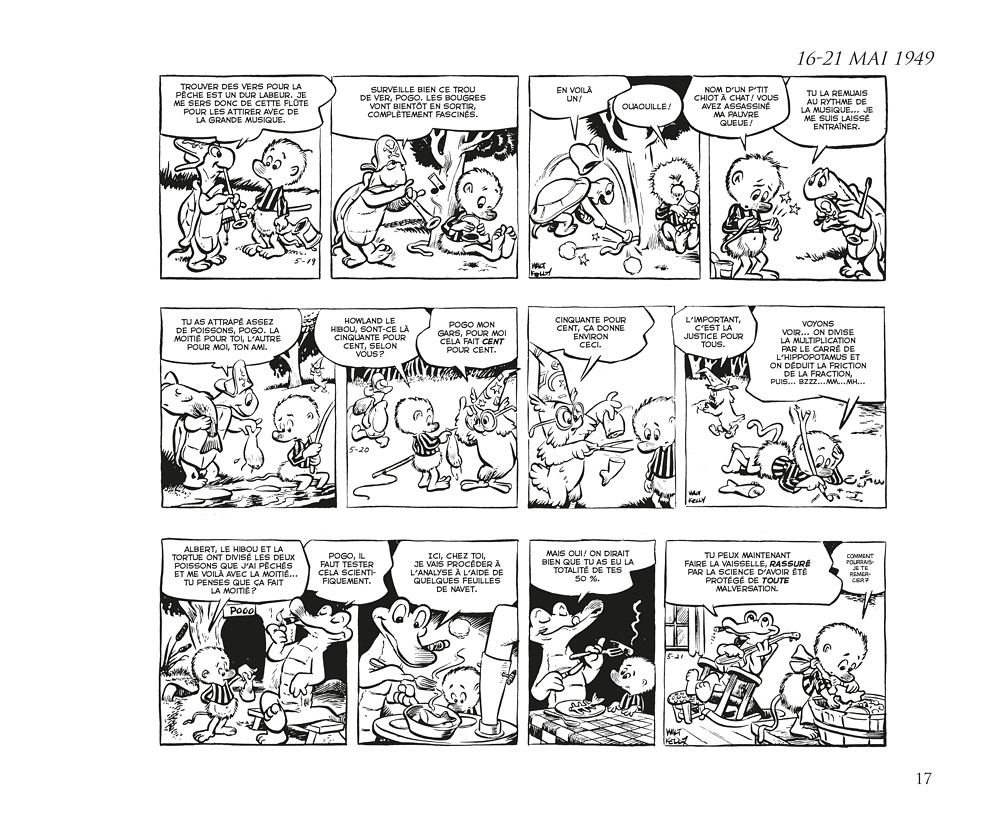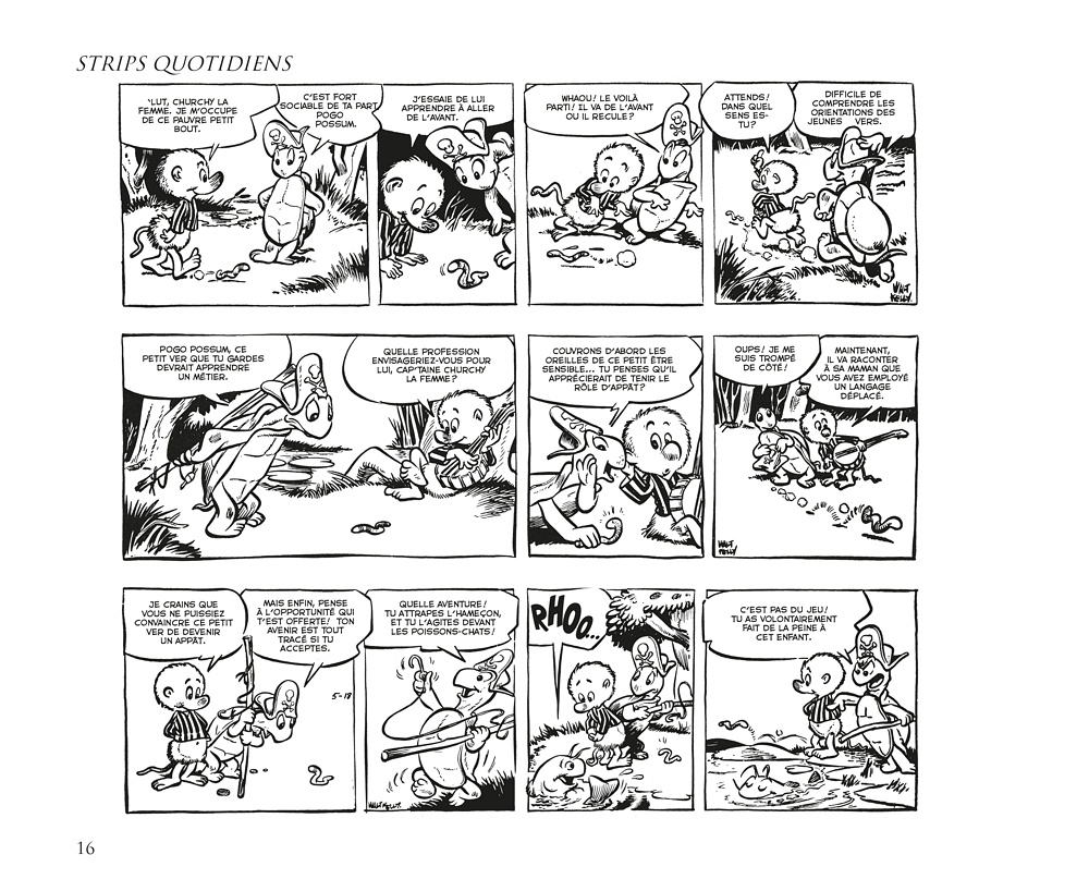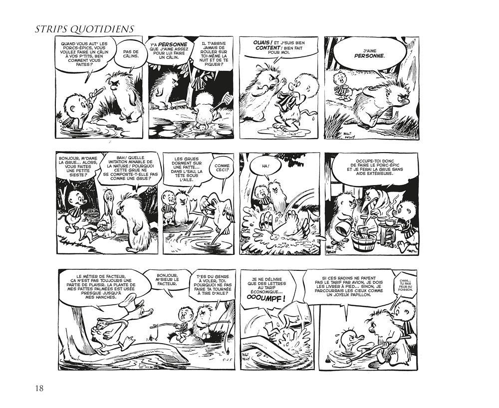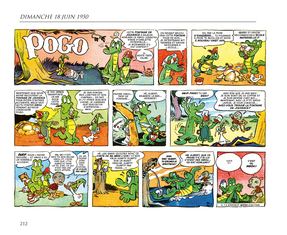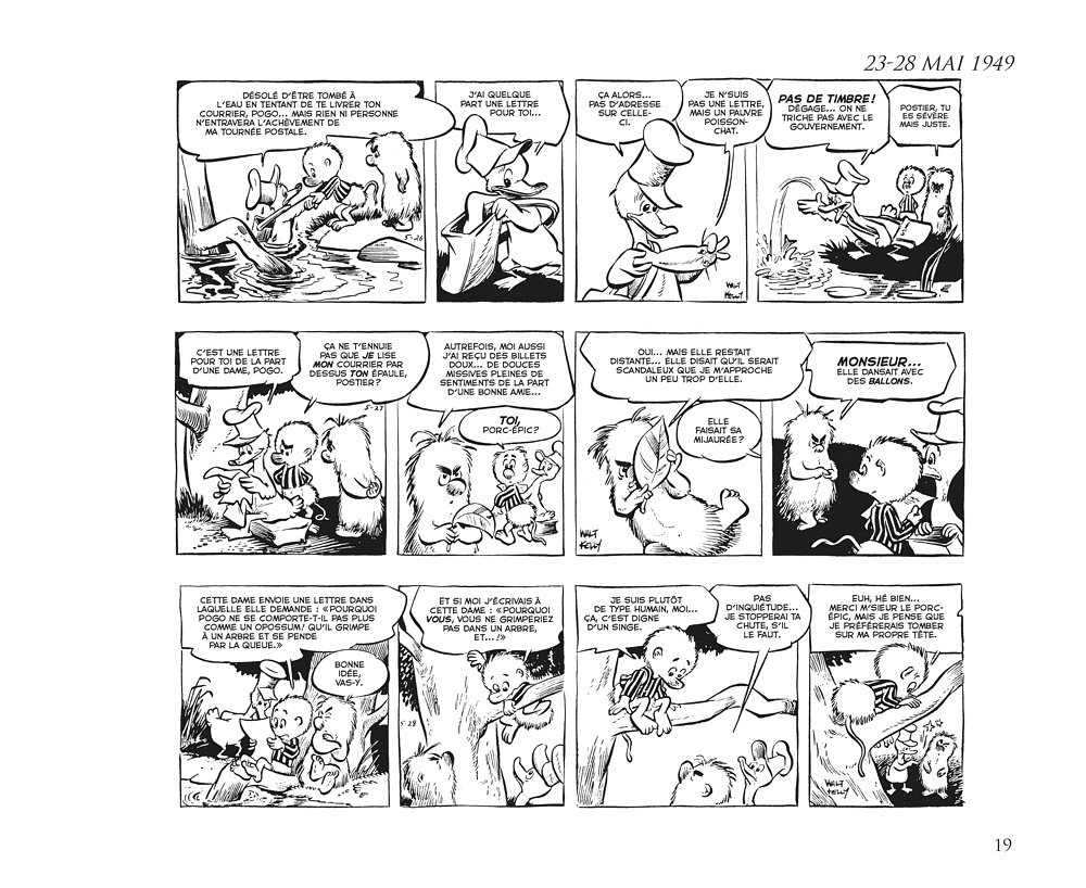 D e 1948 jusqu’à la mi-1973, le Pogo de Walt Kelly était l’un des strips les plus brillants des pages BD des journaux américains avec des personnages haut en couleur (même pour une série en noir et blanc), plein d’humour et d’intelligence. Il s’agissait d’une bande dessinée qui présupposait que ses lecteurs étaient eux aussi drôles et intelligents… Sinon, on pouvait toujours admirer les jolis dessins. Le style fertile et vivant de Kelly vous attirait dans son marais, et sa délirante galerie de personnages vous poussait à y revenir suivre les aventures de Pogo Possum, mais aussi d’Albert Alligator, Churchy LaFemme, de la charmante Mam’zelle Hepzibah, de Porky Pine et des centaines d’autres habitants mémorables des marais qui ont jailli de l’esprit et du pinceau de Kelly. L’un des sommets de l’histoire de la bande dessinée.