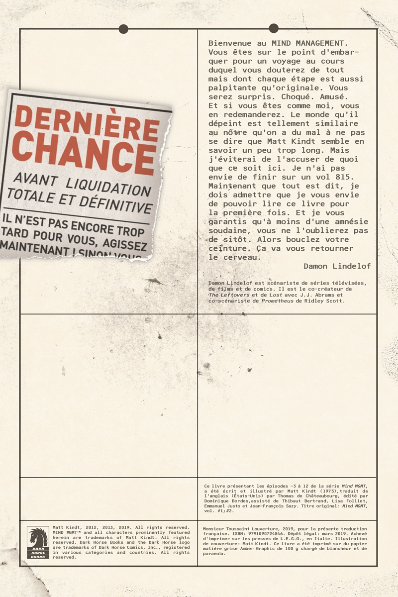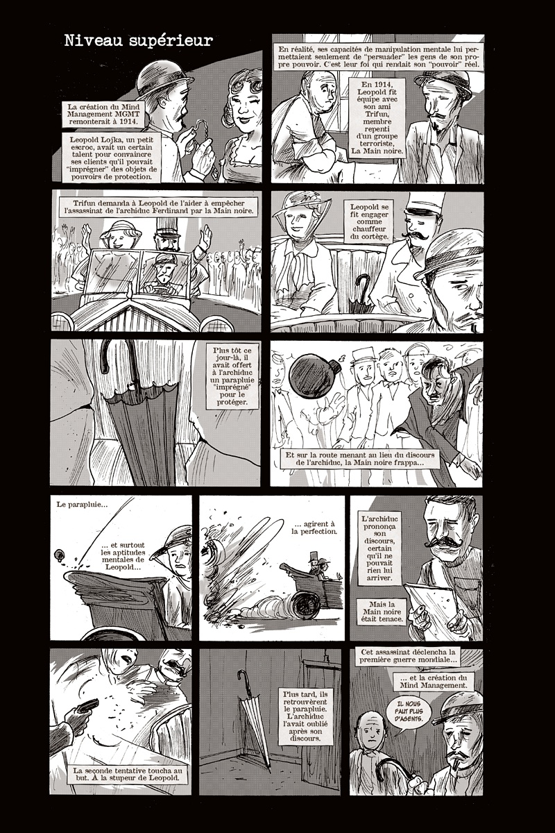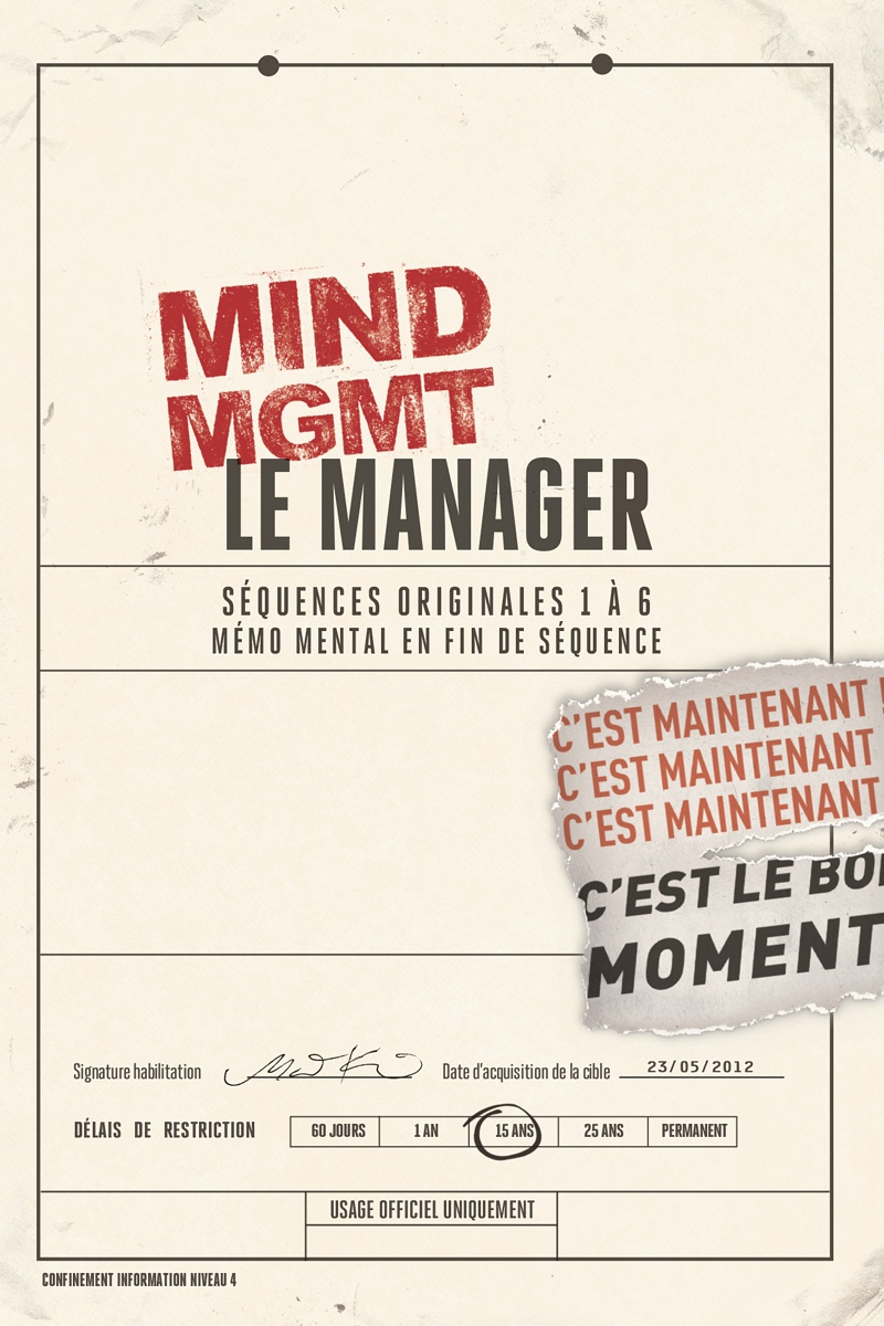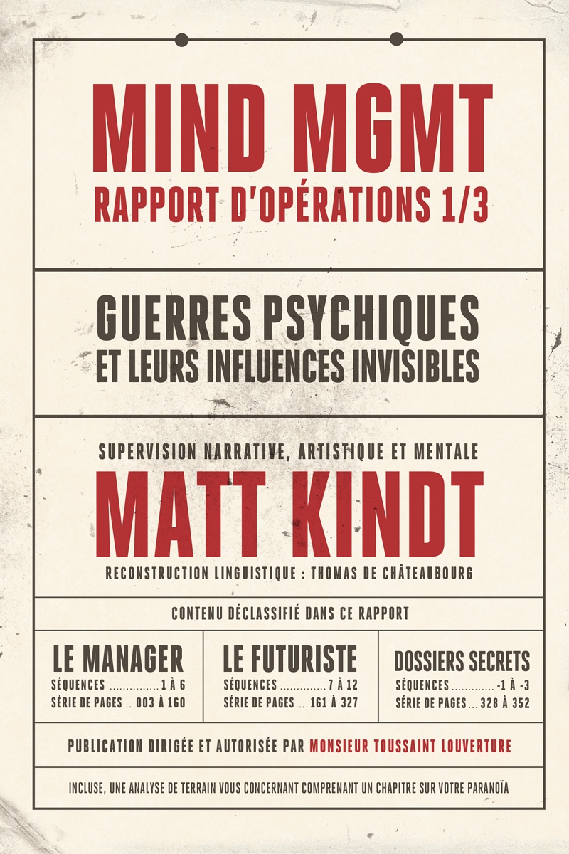 t s’il existait des individus capables de manipuler la mémoire des autres ? Et si certains, en ayant accès aux pensées des êtres vivants à proximité, pouvaient prédire le futur ? Et si quelqu’un, visualisant le moindre défaut dans chaque chose, bâtiment, arme ou homme, s’en servait pour la détruire ? Et si toutes ces personnes aux pouvoirs terrifiants étaient réunies au sein d’une même agence gouvernementale qui agit dans l’ombre ? Entrez dans l’univers fascinant et paranoïaque du MIND MANAGEMENT, préparez-vous à douter de tout, à suivre des pistes que vous avez déjà suivies, à vous battre contre des ennemis immortels, à parler avec des dauphins, à remonter les méandres du MIND MANAGEMENT aux quatre coins du globe pour répondre à cette simple question : qui êtes-vous en vérité ?
