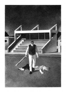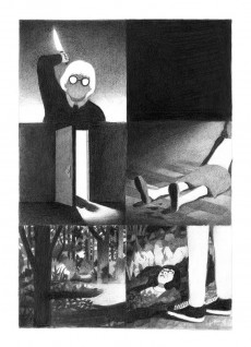 Véritable hommage au cinéma de genre américain, L’Entaille nous plonge dans le quotidien d’une petite ville de bords de mer dont la tranquillité est soudainement rompue pars l’arrivée d’un tueur en série. On y retrouve ainsi tous les codes du slasher ou du teen movie qui sont ici habilement adaptés en bande dessinée. Les planches, entièrement réalisées au crayon papier, provoquent un sentiment d’irréalité proche du rêve éveillé et nous baignent instantanément dans une ambiance feutrée.