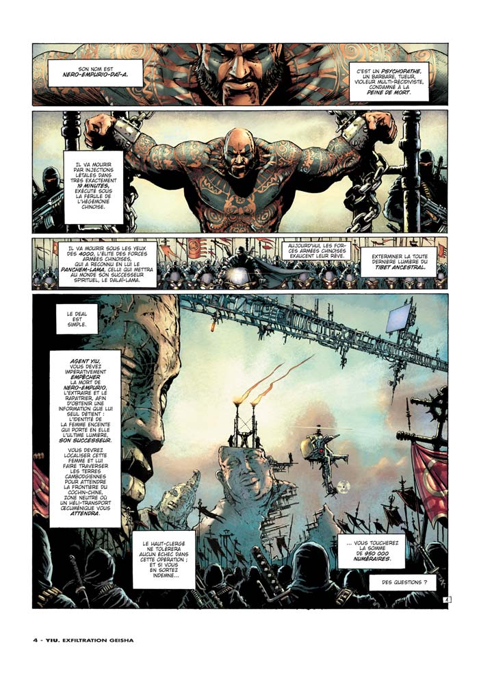 on nom est Nero-Empurio-Daï-a. C'est un psychopathe barbare, tueur, violeur. Multirécidiviste. Il se trouve actuellement détenu dans l'état d'Angkor-Cambodge, sous la férule de l'Hégémonie Chinoise. Il va y être exécuté dans exactement 19 minutes. Il va mourir sous les yeux des 4000, l'élite des forces Armées chinoises. Car outre ses crimes odieux, il est aussi le Panchem-Lama, celui qui désignera son successeur spirituel, le Dalaï Lama. Aujourd'hui, le bras armé de la chine exauce son rêve, exterminer la dernière lumière du Tibet Ancestral. Une geisha porte en son ventre le prochain Dalaï Lama.