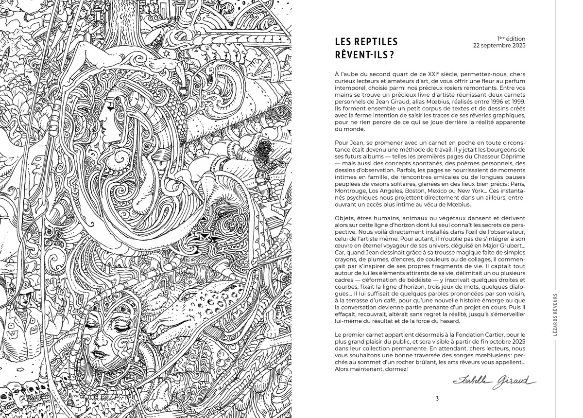 L ézards rêveurs réunit deux carnets personnels de Jean Giraud Mœbius, tous deux réalisés entre 1996 et 1999. Ils forment ensemble un petit corpus de textes et de dessins créés avec la ferme intention de saisir les traces de ses rêveries graphiques, sans rien perdre de ce qui se joue derrière la réalité apparente du monde...