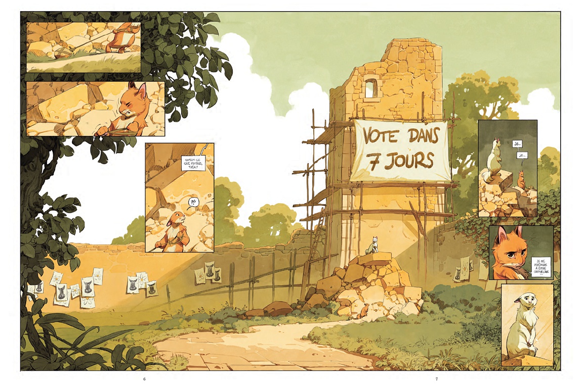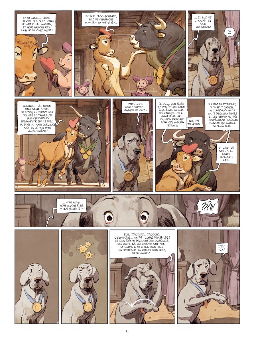 C 'est une petite victoire pour les animaux : le dictateur Silvio a dû se résoudre à organiser un vote... et donc peut-être à remettre son mandat en jeu ! Au Château, la campagne pour l'élection présidentielle bat son plein, et du côté du taureau-despote, tous les coups (bas) sont permis. Mais le Mouvement des Marguerites est plus mobilisé que jamais pour renverser le taureau dictateur, bien décidé aussi à rappeler toutes les injustices dont sont victimes les animaux ! Miss B, César et Azélar auront-ils raison du cruel taureau Silvio ? La liberté est-elle à portée de pattes ?