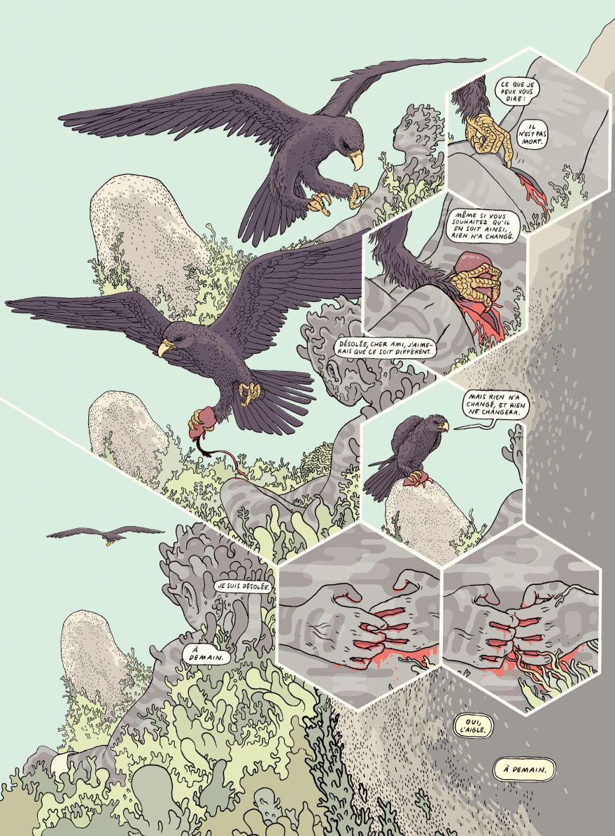 l est dit qu’un jour les dieux enchaînèrent l’un des leurs sur le mont Caucase, pour le punir d’avoir amené le feu aux humains… Des millénaires plus tard, le supplicié subit toujours la même punition – et, inexorablement, l’aigle, avec lequel il entretient désormais une étrange relation, vient se repaître de son foie. Mais dorénavant, c’est la vengeance qui l’habite.