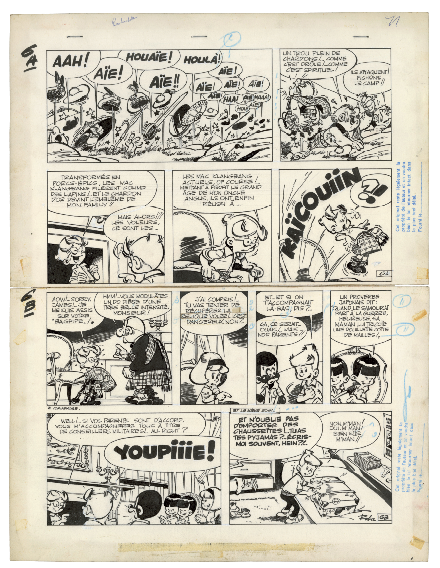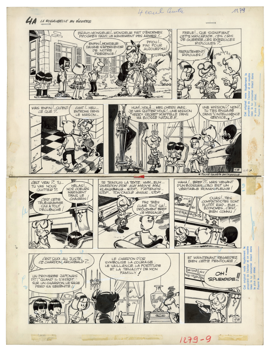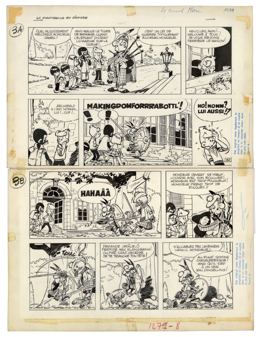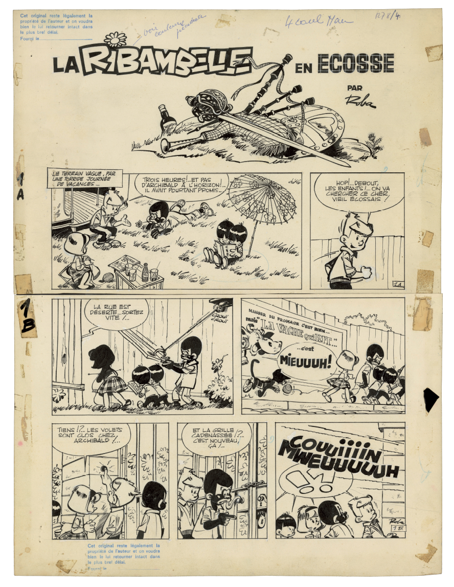C e qui fait la force exceptionnelle de La Ribambelle en Écosse, prépublié dans le Journal de Spirou du 11 octobre 1962 au 7 mars 1963, ce sont avant tout les décors, autant de merveilleuses invitations au voyage tracées de main de maître par Roba. Dès l'arrivée dans le pays situé « au nord » de « la vieille Angleterre », on découvre en effet « les splendeurs » du paysage local. La guerre des clans fait cependant rage, car les Mac Klangbang et les Mac Dingelling, le lignage d'Archie, se disputent la possession d'un talisman ancestral. Les hommes s'affrontent à coups de troncs d'arbre et ne crachent pas sur le breuvage tourbé local, « le plus fort whisky in the world », dont une giclée dans l'âtre déclenche un jet de flammes. Scénario et dialogues servent de support à une avalanche de gags de haut vol.