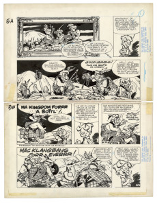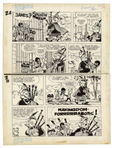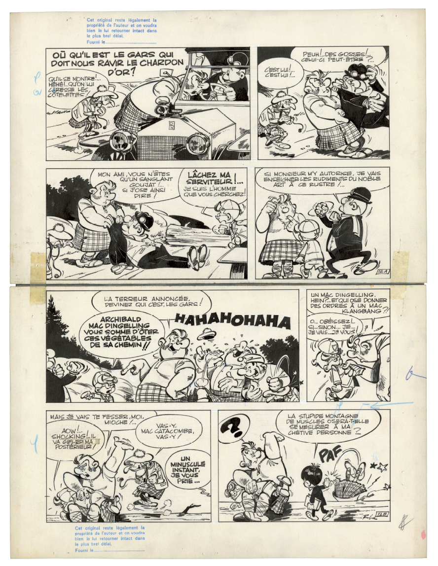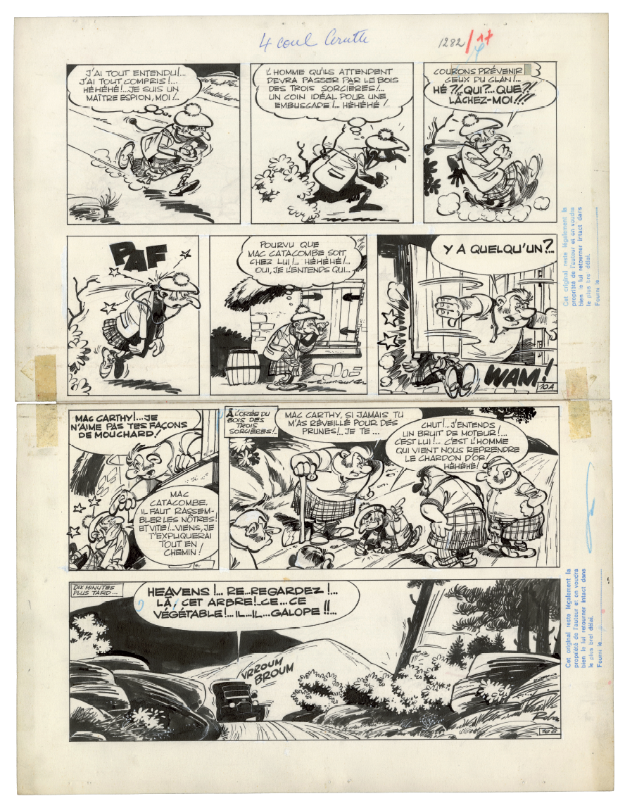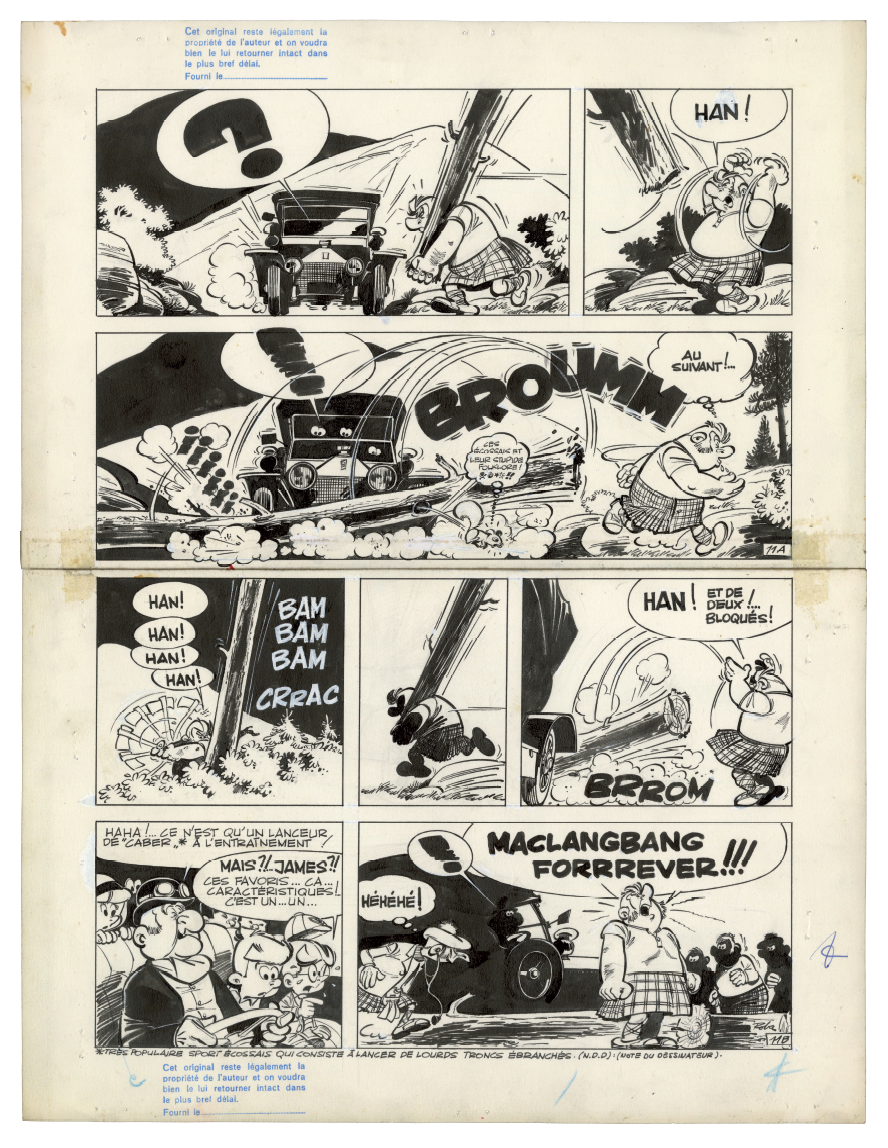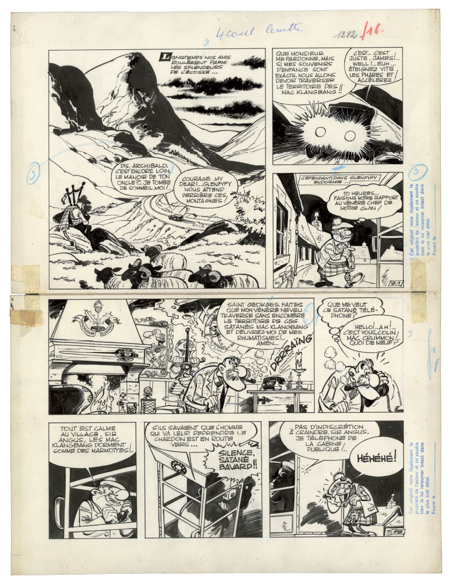 C e qui fait la force exceptionnelle de La Ribambelle en Écosse, prépublié dans le Journal de Spirou du 11 octobre 1962 au 7 mars 1963, ce sont avant tout les décors, autant de merveilleuses invitations au voyage tracées de main de maître par Roba. Dès l'arrivée dans le pays situé « au nord » de « la vieille Angleterre », on découvre en effet « les splendeurs » du paysage local. La guerre des clans fait cependant rage, car les Mac Klangbang et les Mac Dingelling, le lignage d'Archie, se disputent la possession d'un talisman ancestral. Les hommes s'affrontent à coups de troncs d'arbre et ne crachent pas sur le breuvage tourbé local, « le plus fort whisky in the world », dont une giclée dans l'âtre déclenche un jet de flammes. Scénario et dialogues servent de support à une avalanche de gags de haut vol.