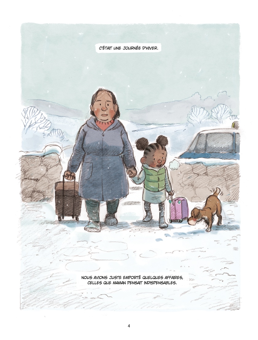Une petite fille et sa maman, toutes les deux réfugiées d'un pays lointain, viennent vivre '' de l'autre côté du monde '', un autre côté qui ressemble à la France. Elles débarquent en plein hiver et vont habiter chez une vieille dame qui les accueille et leur dit de rentrer '' car il fait un froid de démons, dehors ''. Il n'en faudra pas plus pour que notre petite héroïne en croise un pour de bon.