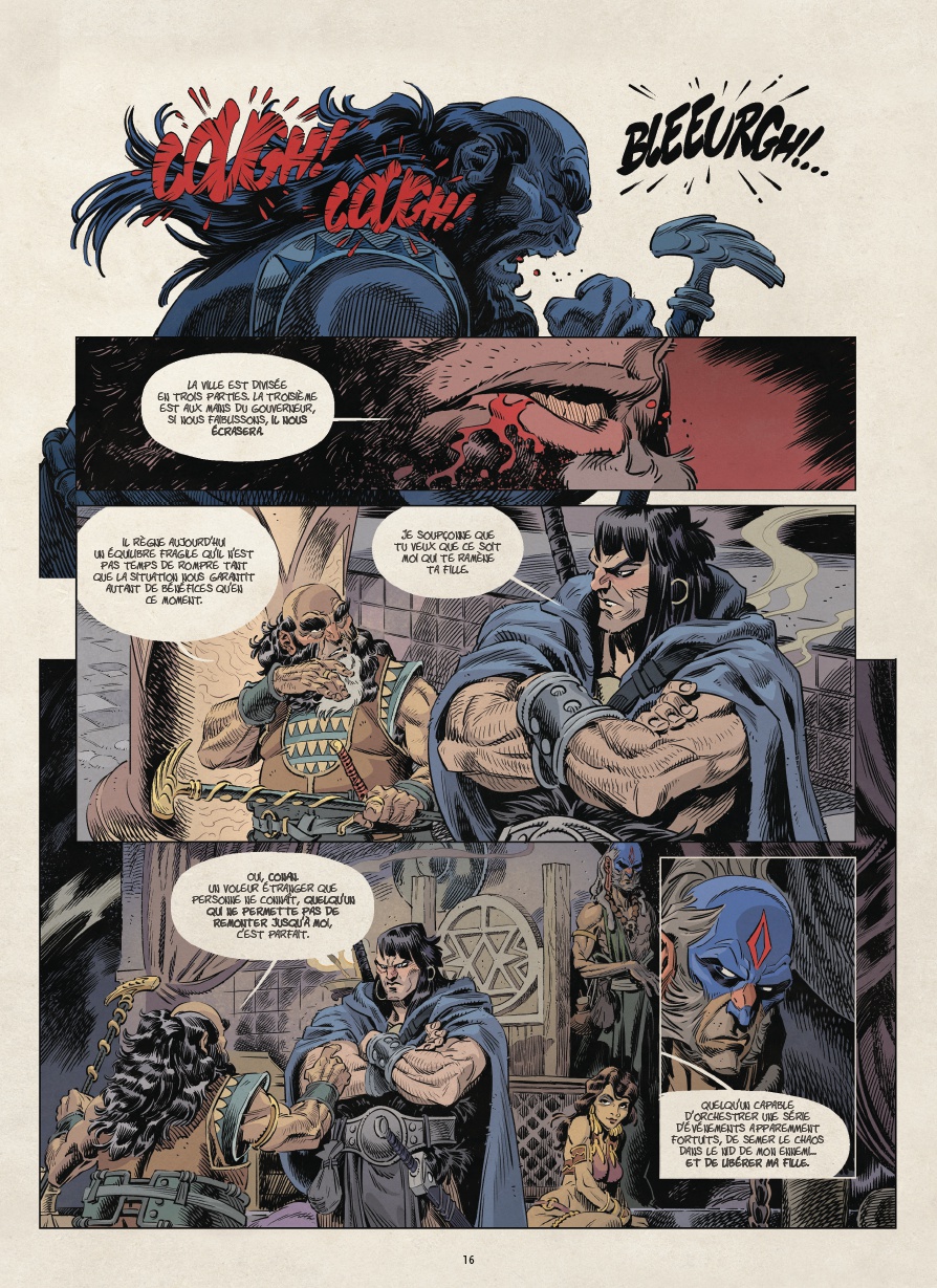 ans cette aventure inédite, Conan qui n'est pas encore roi, accepte une mission simple : délivrer la fille d'un chef de clan, soi-disant enlevée par un rival. Mais dans les ruelles fétides de Hud-hund Engaun, les apparences sont trompeuses...