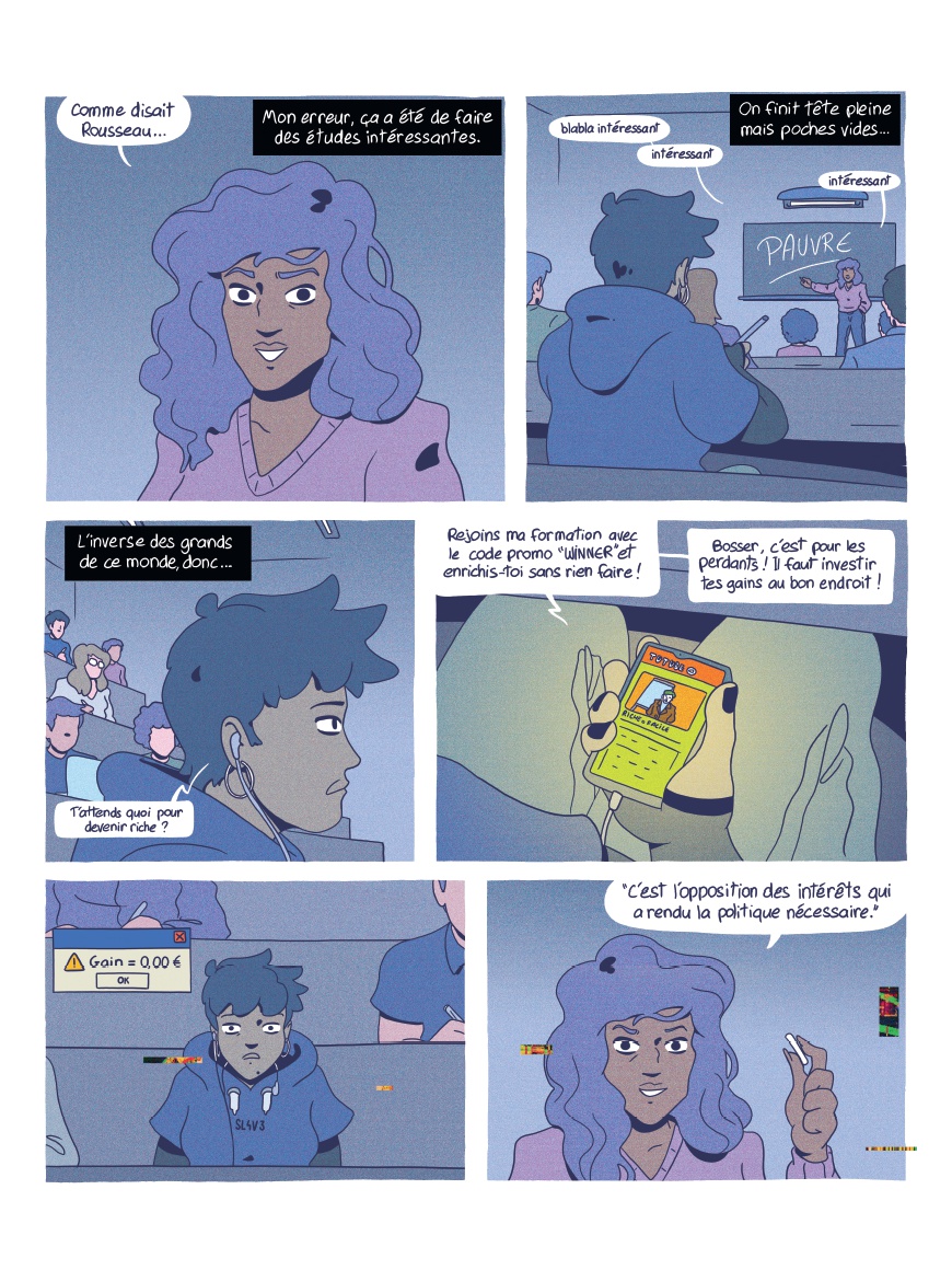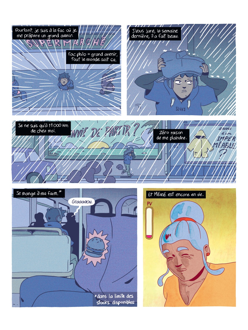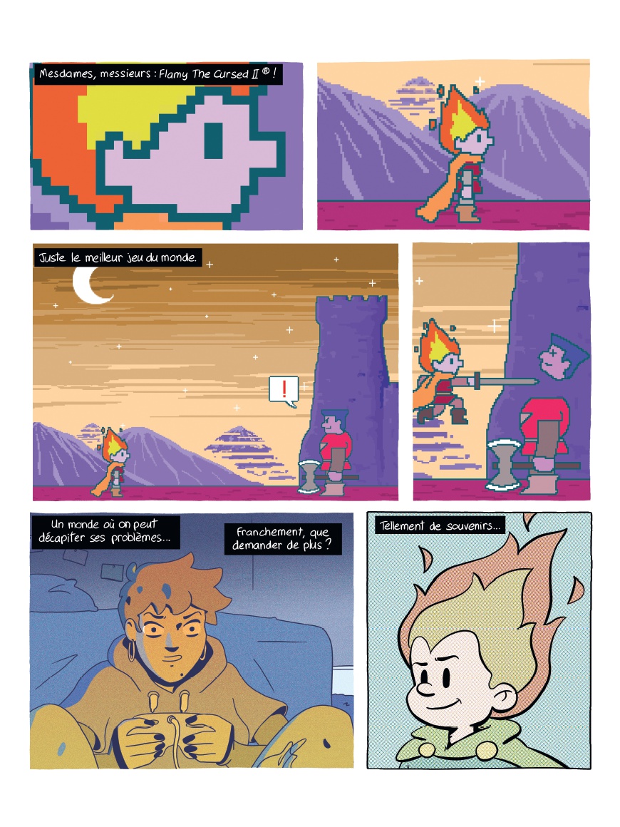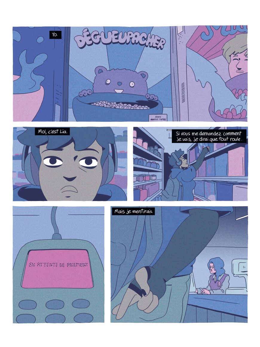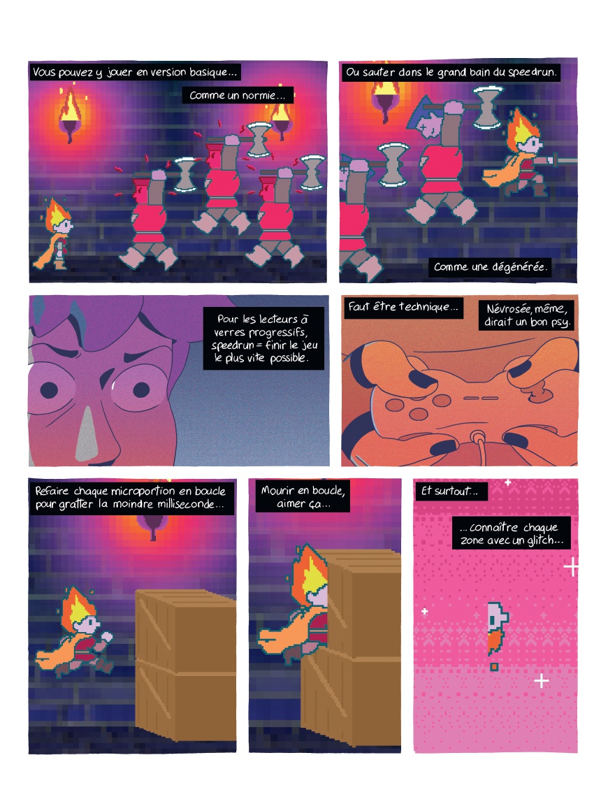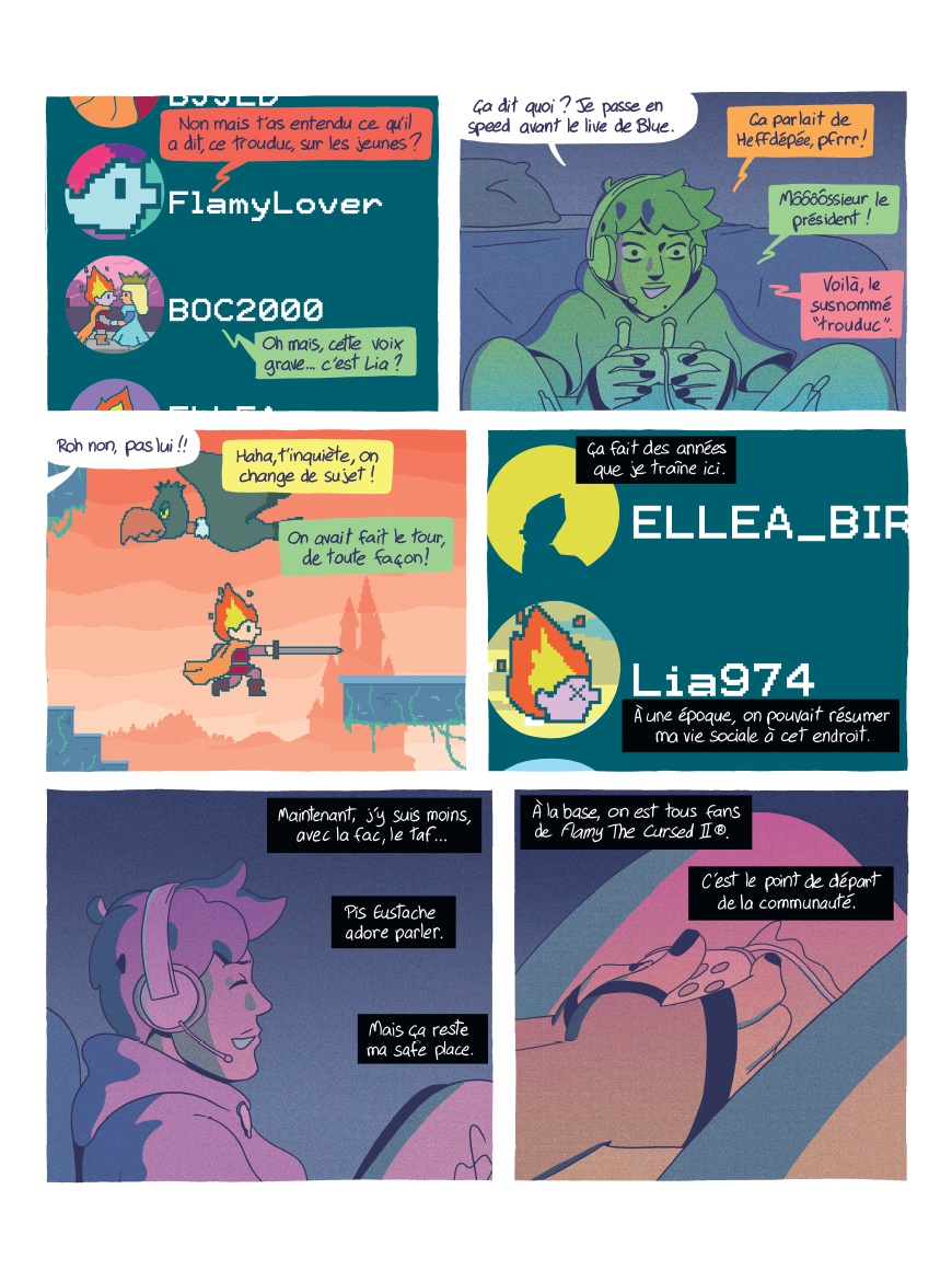 Réunionnaise, Lia a quitté son île pour la grisaille de la capitale en laissant derrière elle sa mère et sa grand-mère. Mais à Paris, la jeune étudiante s'enlise dans la précarité et la solitude... Heureusement, entre les cours et son job alimentaire, Lia a trouvé sa safe place : Internet, et plus particulièrement le speedrun, l'art de finir un jeu vidéo le plus rapidement possible. Elle ne rate d'ailleurs aucun stream de Blue Fire, célèbre runneuse sur Flammie le maudit, l'adaptation retro d'une BD culte que Lia connaît par coeur. Ce refuge numérique lui permet de s'évader autant qu'il l'isole. Pendant que la colère gronde dans les rues et que de nouvelles réformes sociales et numériques menacent la jeunesse, Lia ne lâche plus sa manette. Rivée devant l'écran, elle découvre un jour un glitch inédit, un bug du jeu qui permettrait à Blue de gagner de précieuses secondes et exploser son record... De cette découverte, une amitié à distance va naître, donnant de l'espoir à Lia, tout comme à Blue, de poursuivre leurs rêves. Internet semble leur offrir leur revanche sur ce monde anxiogène qui les rejette. Cela suffira-t-il pour que Lia retrouve la force de continuer à jouer, à étudier, à militer... à vivre ?